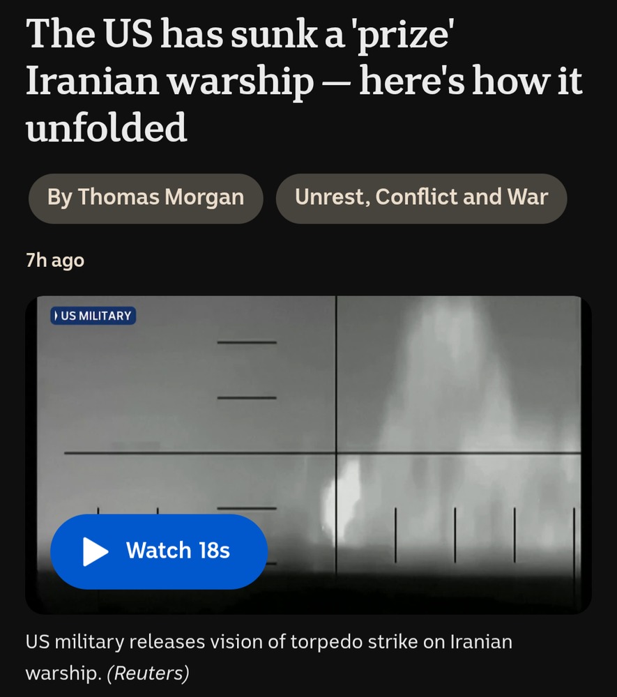 I see that someone sank an Iranian warship with a torpedo without notification. It would have been easy to notify the sailors that they should abandon ship before impact, but no, the murderous cunts in charge of the US navy are backslapping each other over the deaths of hundreds of people.