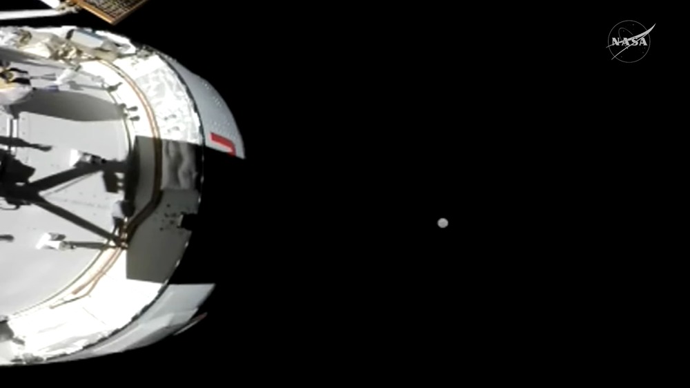 View a moment ago, from a camera on one of the solar sails, shows the spacecraft and the moon, which is still about 250,000 km away.