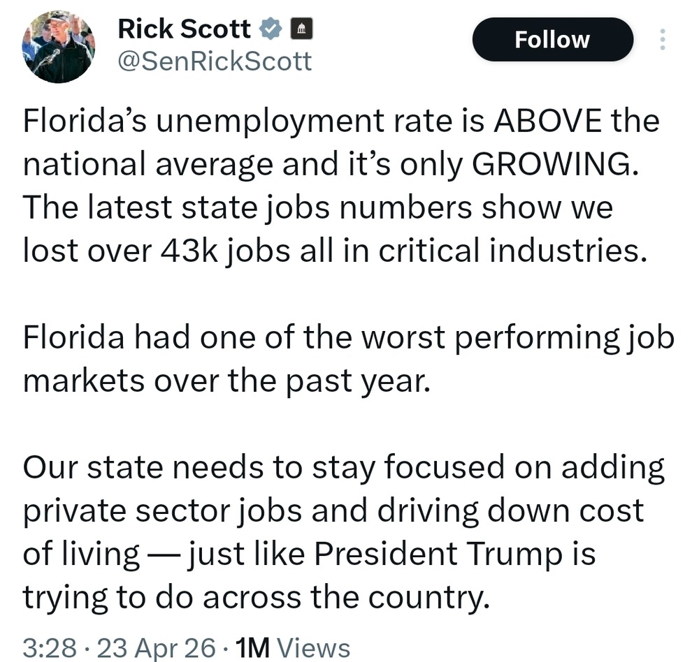 For context, Scott is a Republican senator from Florida. The state has been completely in Republican control since late in the 2nd millennium AD. His party control all three branches of the federal govt.