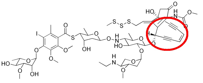 The interesting part is the “warhead” which is an enediyne moiety. This undergoes a Bergman cyclization, generating a 1,4-didehydrobenzene diradical that abstracts hydrogen atoms from the deoxyribose (sugar) backbone.