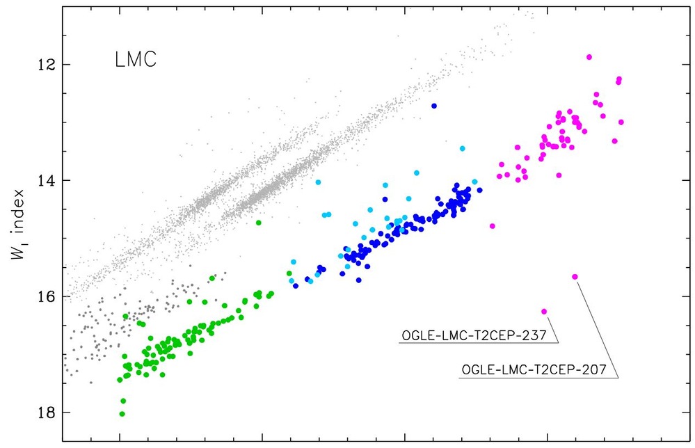 the number of type II Cepheids is much smaller than their classical siblings. Classical cephids form a pair of straight lines on the chart of luminosity vs log period. “Anomalous cephids” form a third line parallel to the first two. Type II cepheids line up in a fourth line parallel to the first three. The study also found two Cepheids (Ogle numbers 207 and 237) that are way out of position.