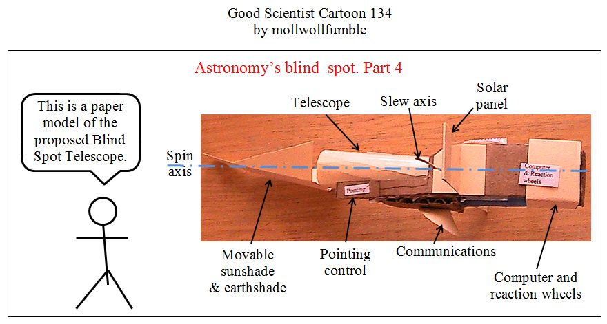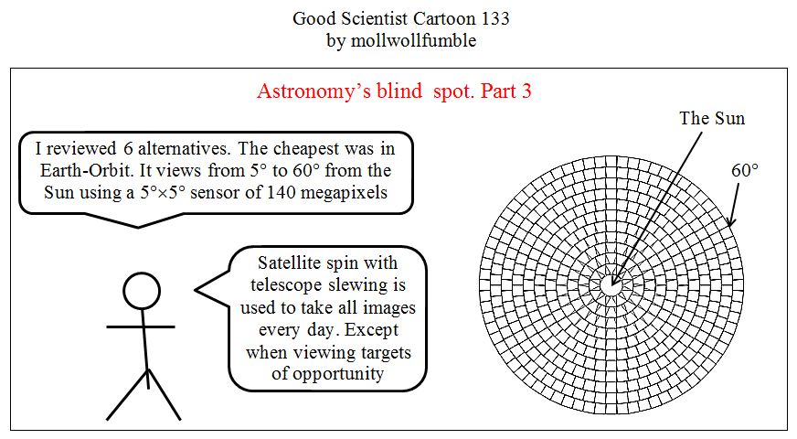 I don’t know whether any of you previously took note of my proposed “Blind Spot” telescope, this is a telescope in LEO with such a good sunshield that it can see stars between the limits of 5 degrees and 60 degrees of the Sun.