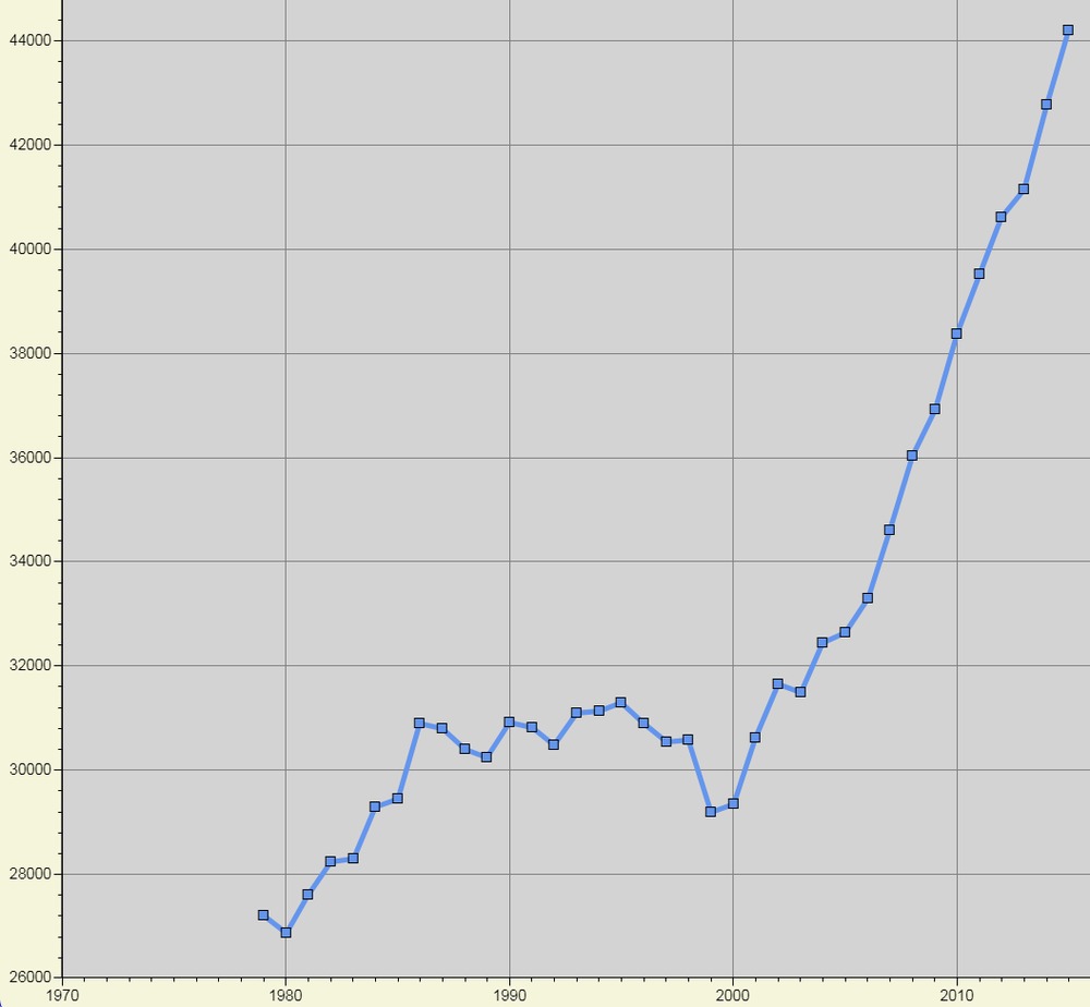 Chart of USA-wide suicide deaths, per year.