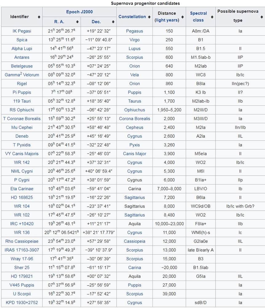 The following is a list of stars that are threatening to go supernova in future. The range of spectral types is astonishing, no two stars in the list have the same spectral class. There’s also a very high probability that the star next to go supernova in the Milky Way is not on that list. There’s about a 75% probability that the next star to go supernova in the Milky Way will be further than 26,000 light years from us.