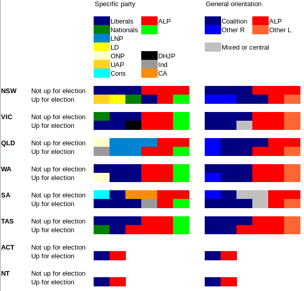 At the moment, the parties of the left holds 35 Senate positions, the right holds 37, and 4 are held by those that I’m calling “mixed or central”: Storer, Central Alliance, Derryn Hinch’s Justice Party.