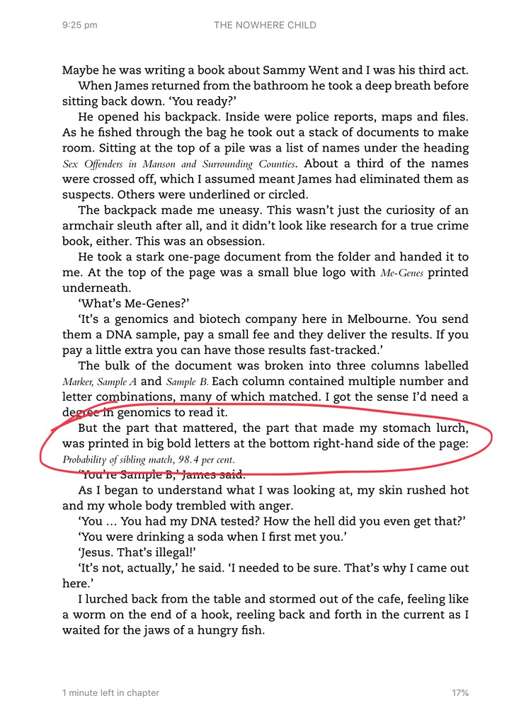 The novel was published this year. The plot revolves around a missing child, who is thought to have ended up overseas and the person searching for her has had their DNA tested. As siblings, he says there’s a 98.4% match between their DNA, thus “proving” they are related.