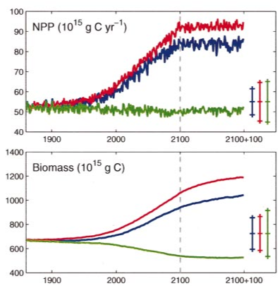 You only need to take account of the dark blue line here, the other two lines are nobbled models with various components removed. NPP is Net Primary Productivity, the rate of growth of natural forests.