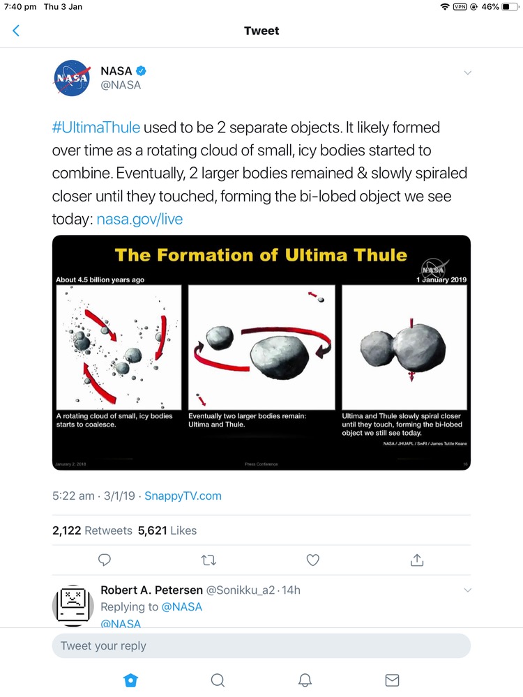 - Ultima and Thule’s are flattened very much along the same principle axis, only a few degrees between them. This strongly suggests they were aligned prior to impact. Impact appears to have been at 2 to 3 m/s, which suggests that they were brought together by the departure of gas, dust, smaller objects in their little system. It is considered that this is a good model for the accretion of planetesimals into protoplanets generally.