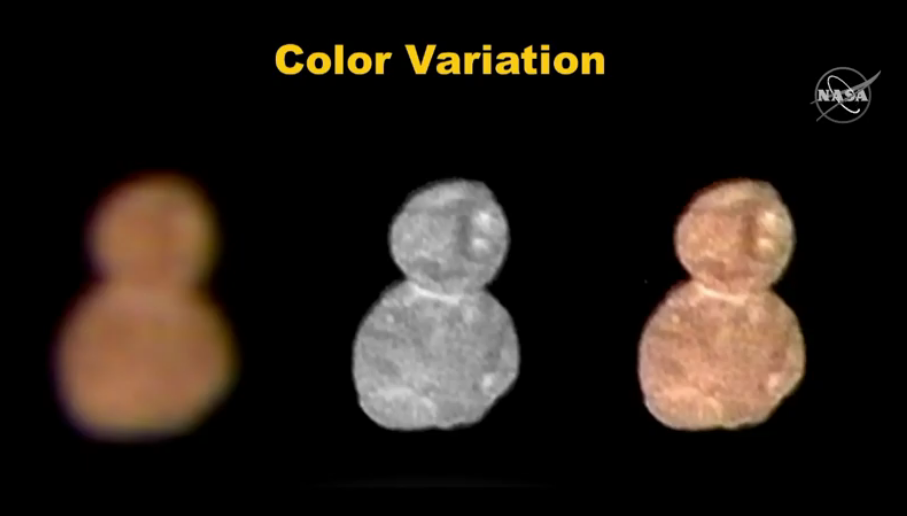 But when the team turns to color images, it’s harder to see evidence of this aggregate structure. MU69’s overwhelmingly red surface shows some variations in color that match surface features, but not the hypothesized small geologic subunits.