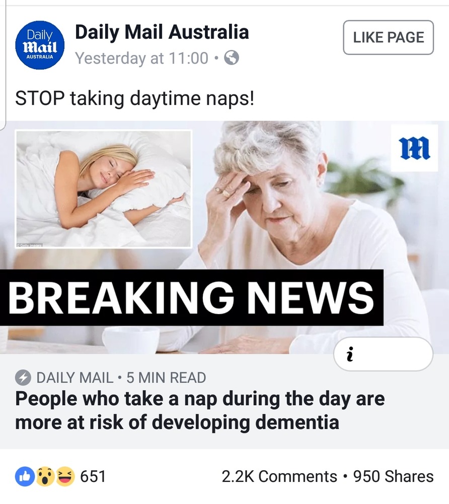 The comments are full of derision by people who have seemingly not read the article, to the effect that scientists constantly change their minds, one minute saying lack of sleep causes Alzheimer’s and the next saying these naps cause Alzheimer’s etc.