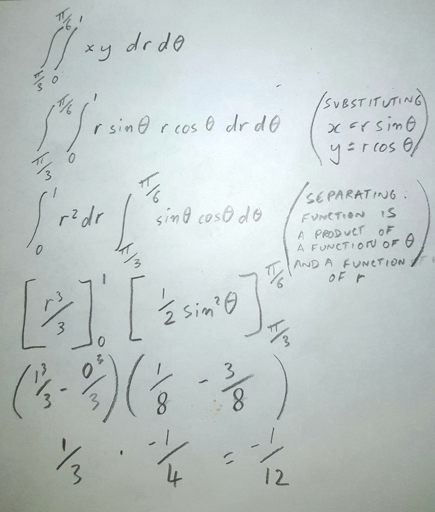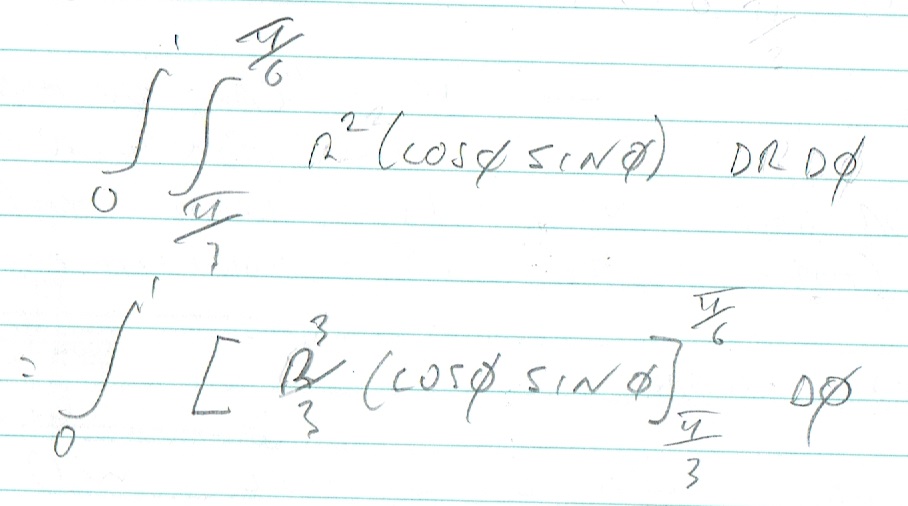 and integral dr from 0 to 1 = r^3/3.(Cos(theta).Sin(theta))