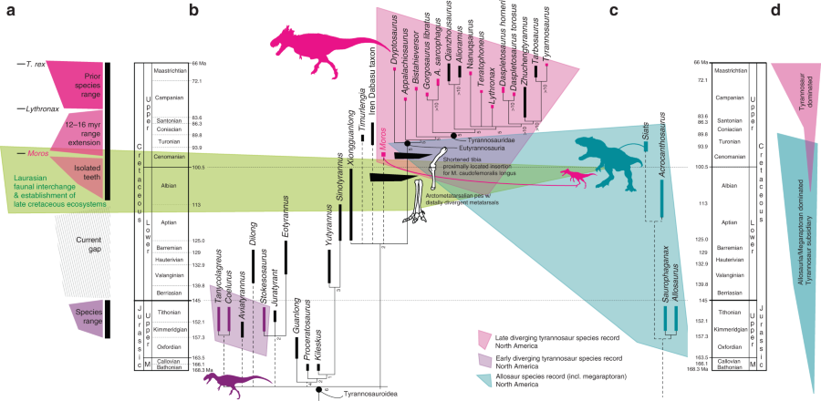 “Older fossils, particularly from Asia, show that about 100 million years prior to that, tyrannosaurs were much smaller. But between those two extremes, there’s a 70-million year gap in the North American fossil record. M. intrepidus helps plug it up, with its discoverers dating it to about 15 million years before the next earliest-known, North American tyrannosaur.”