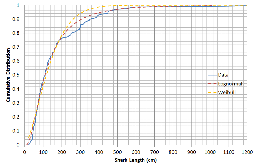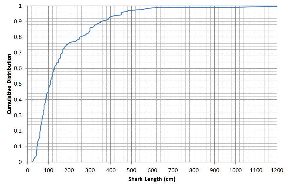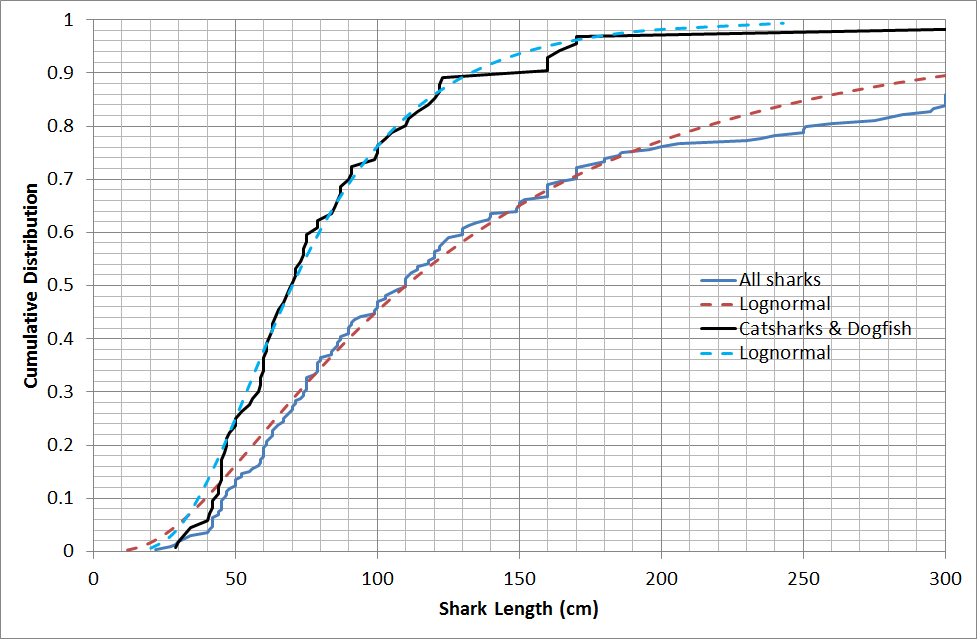 The median upper length for shark species (excluding rays and chimeras) is only 1.1 metres, largely because of the large numbers of small dogfish and catshark species.