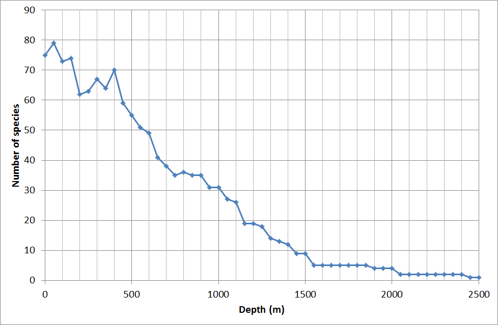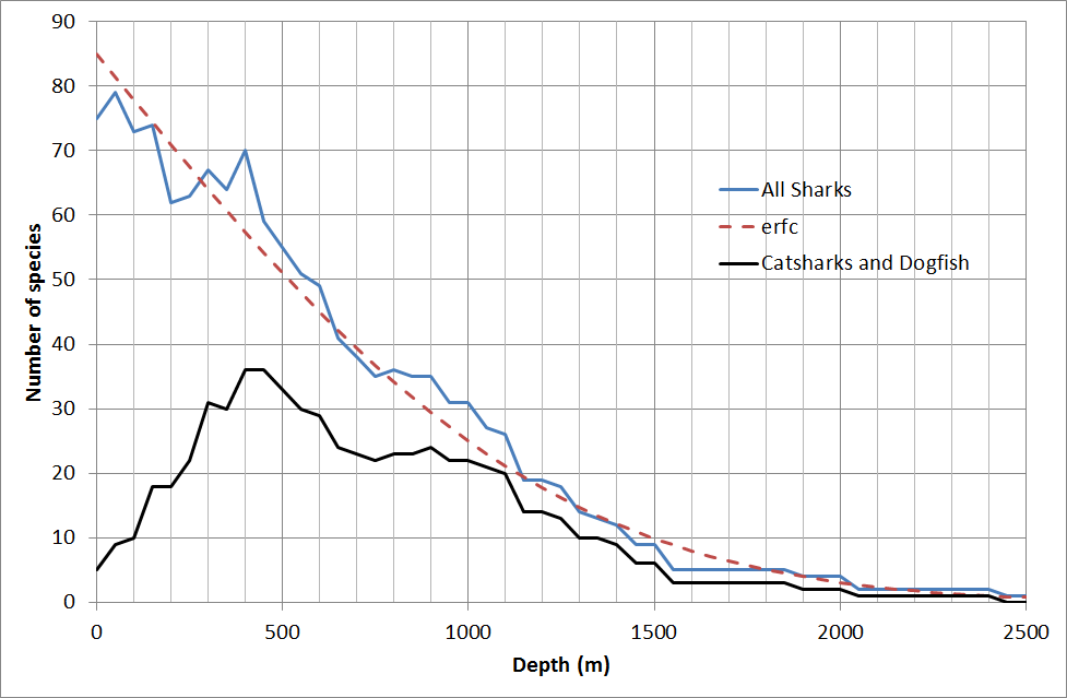 The number of shark species found at a depth of 700 m, which is really deep, is still 50% of the number of shark species found in surface waters.