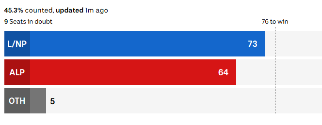 All 151 seats have been declared now. No surprises.77 Coalition, 68 ALP