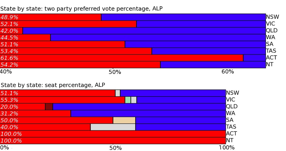 Although each division has been declared, a 2PP count has not yet been announced for all of the divisions in which the final count was not between ALP and the Coalition, so we don’t have the final 2PP yet, but it will be something in the realm of 51.5 – 48.5