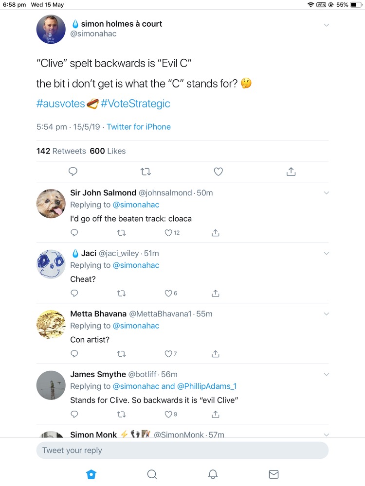 Cymek said:I would be quite amusing if Dee Synder ran against Clive Palmer, he obviously can’t as he isn’t an Australian citizen perhaps doing ads for someone against Clive Palmer.