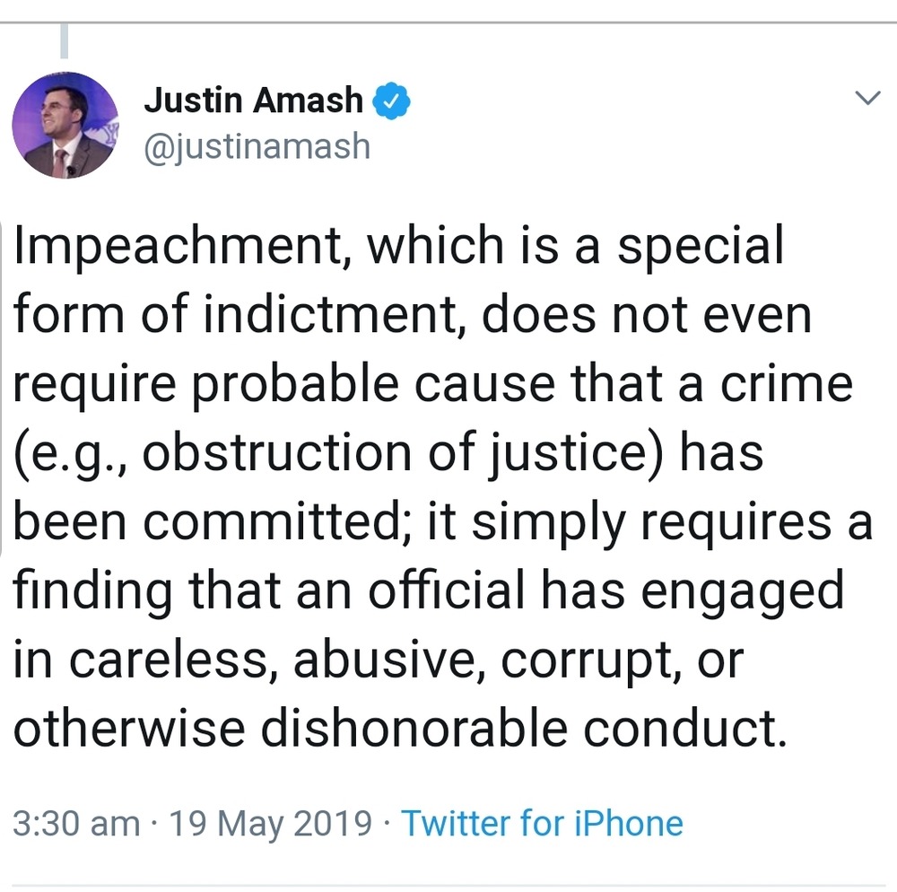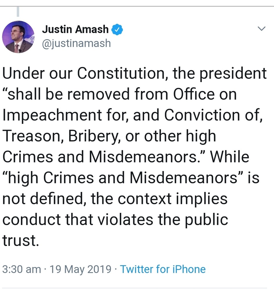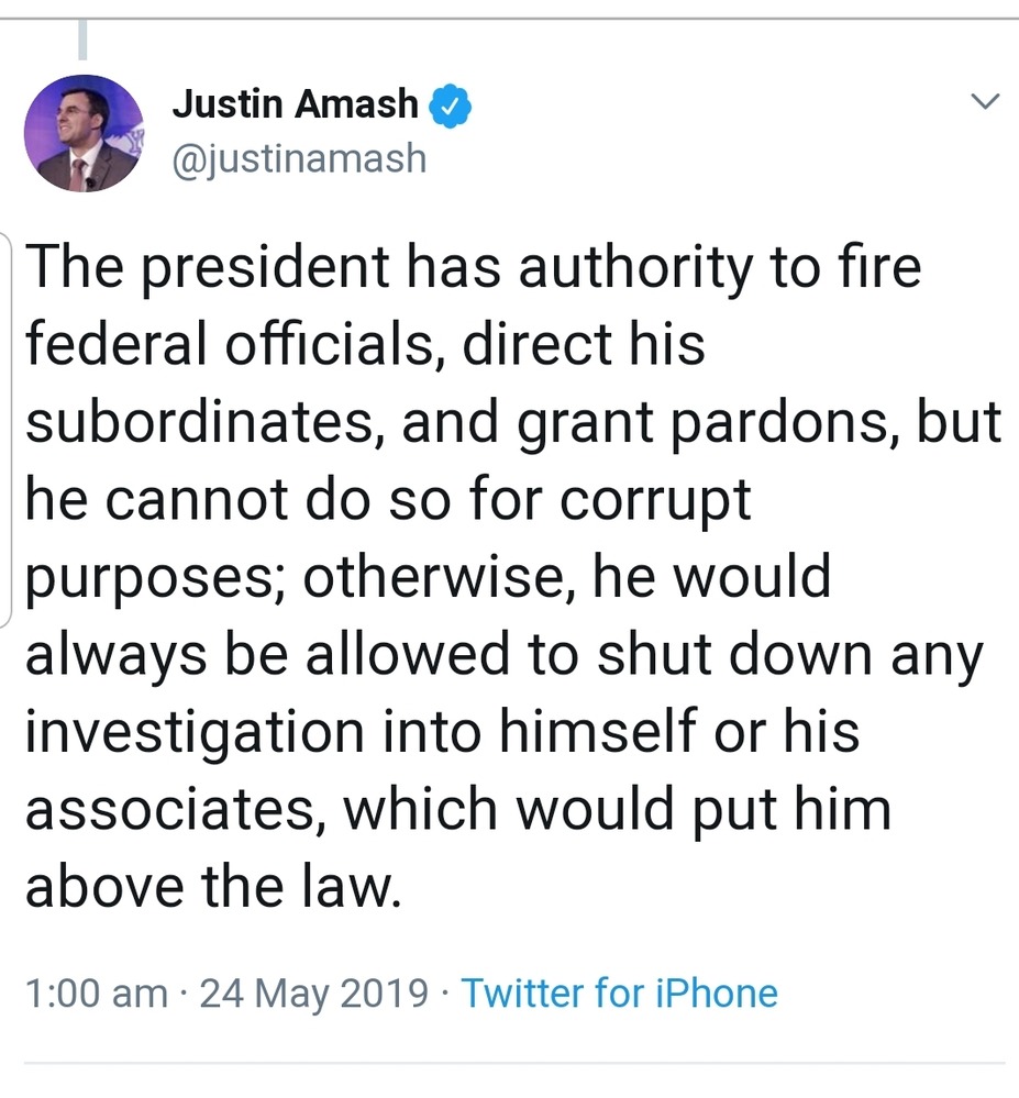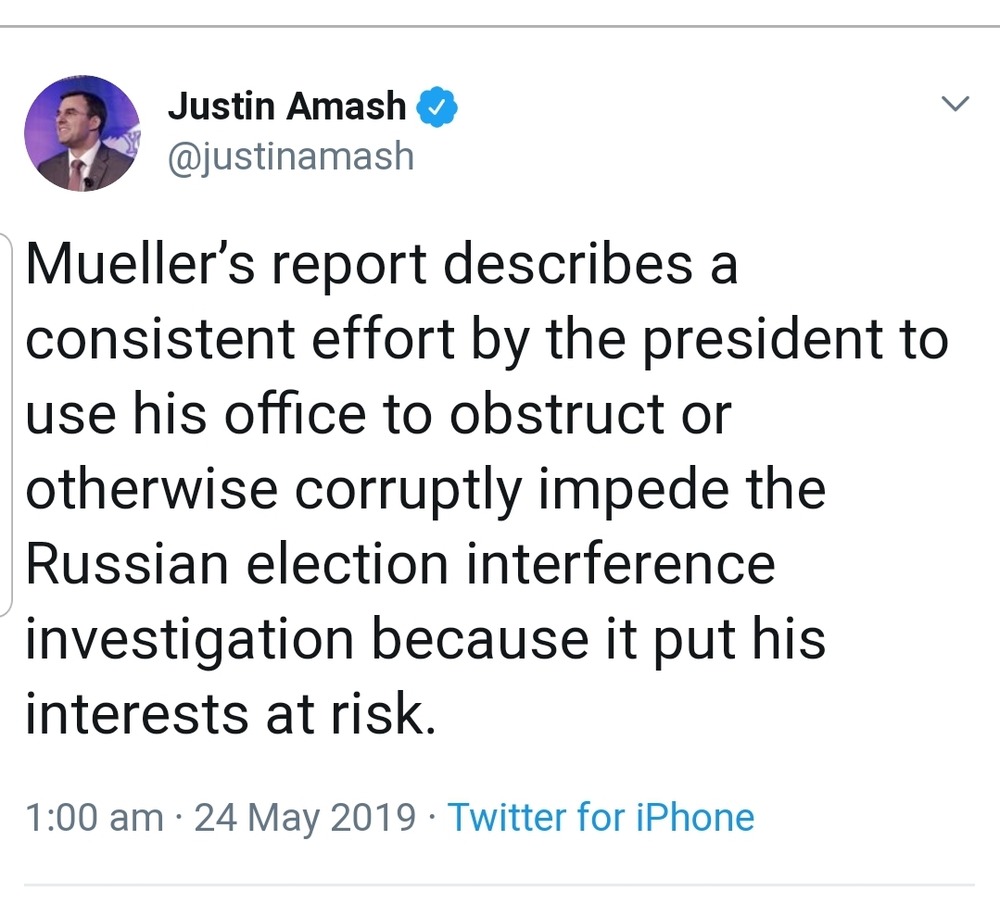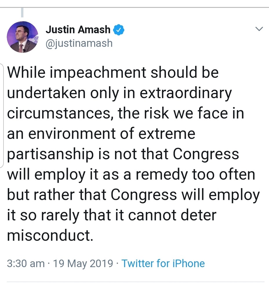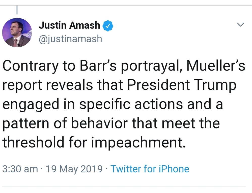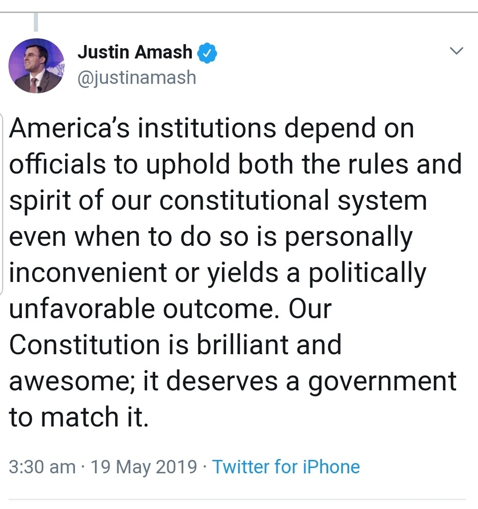 Recently he published a series of Tweets outlining the case for impeachment of President Trump. The case is clearly being made from a conservative and constitutional perspective. As yet, zero other Congressional Republicans have backed his call, though some of said they respect his brave stance and that clearly the Mueller Report raises concerns: it may at least lead some Republicans and Independents to read the damned thing.