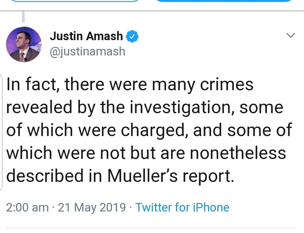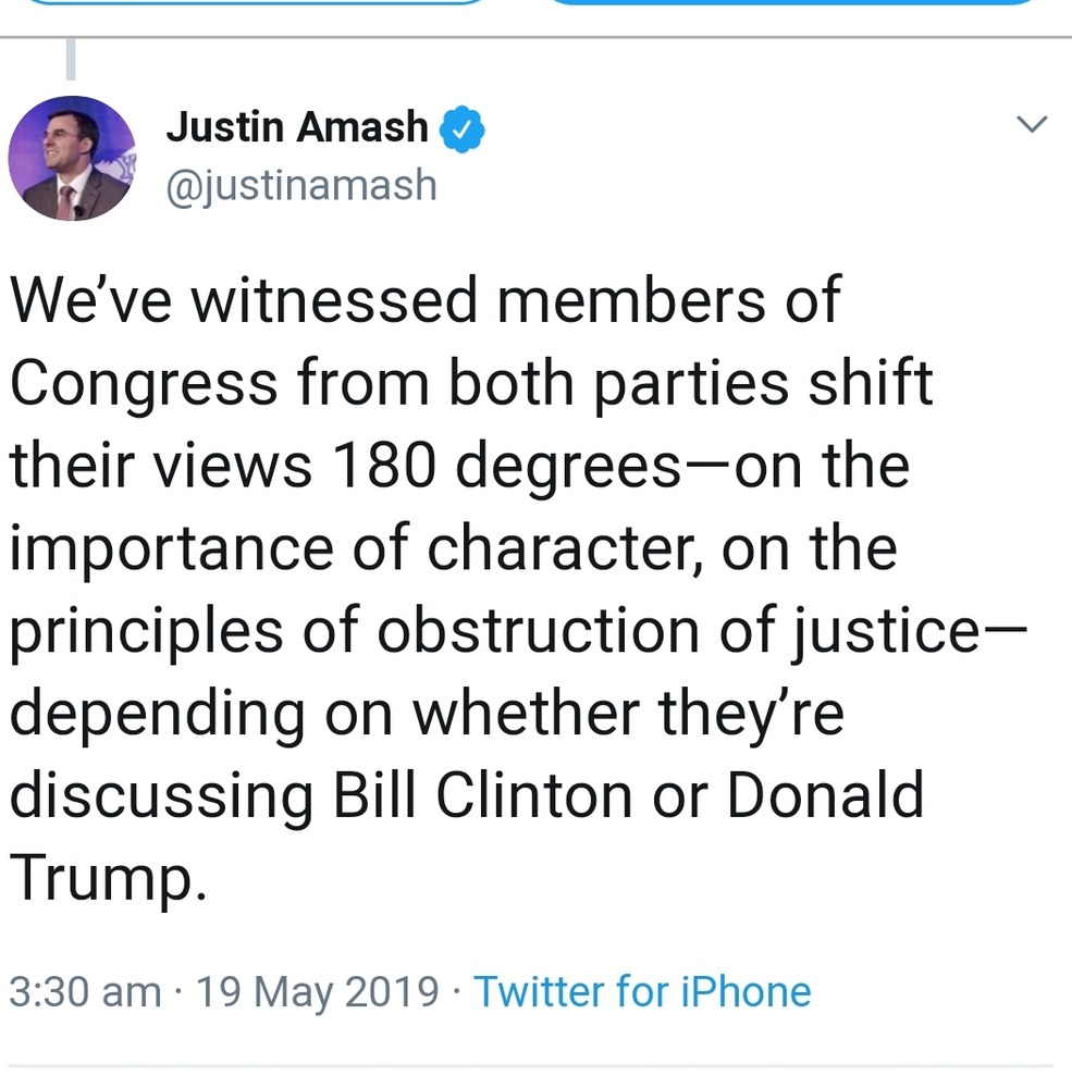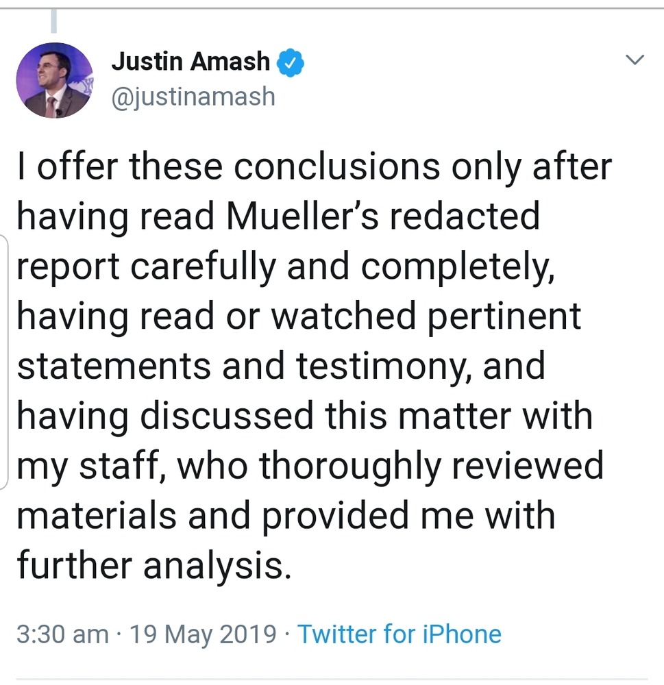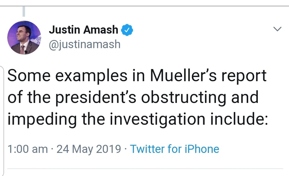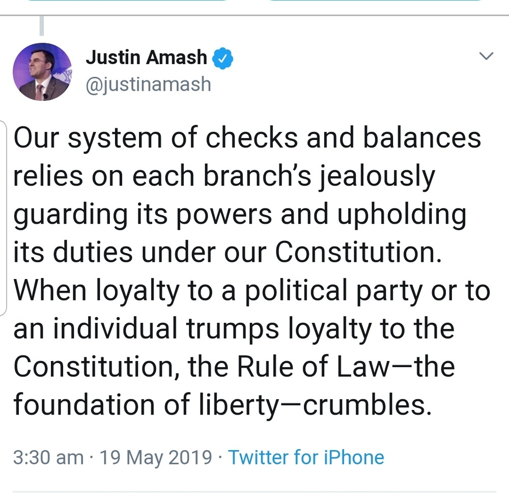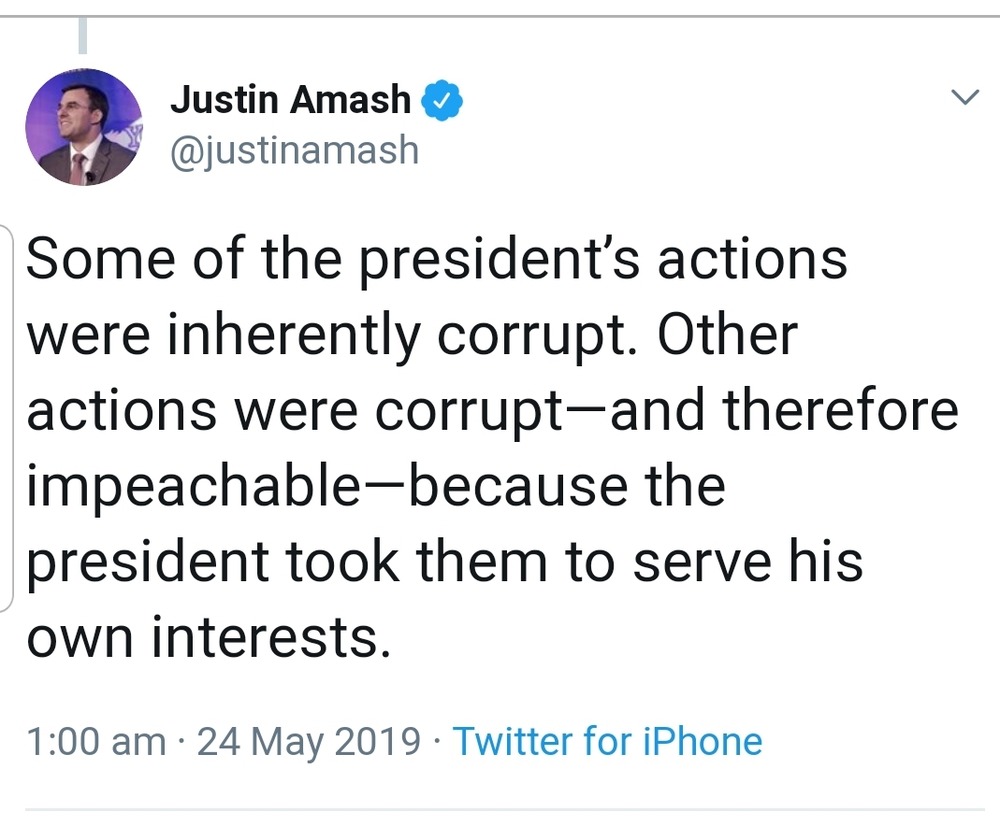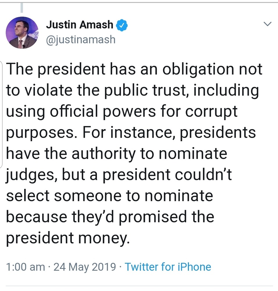 Recently he published a series of Tweets outlining the case for impeachment of President Trump. The case is clearly being made from a conservative and constitutional perspective. As yet, zero other Congressional Republicans have backed his call, though some of said they respect his brave stance and that clearly the Mueller Report raises concerns: it may at least lead some Republicans and Independents to read the damned thing.