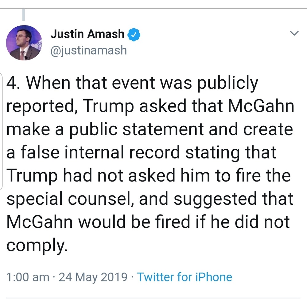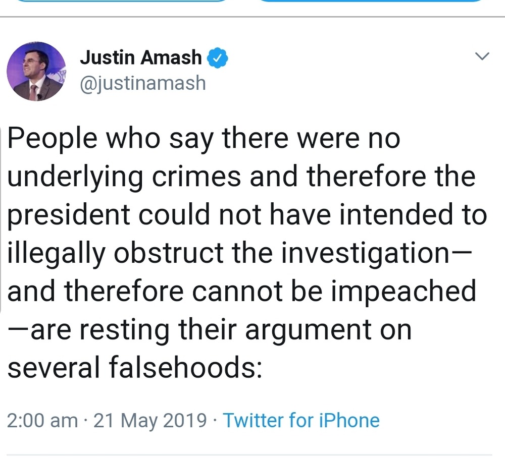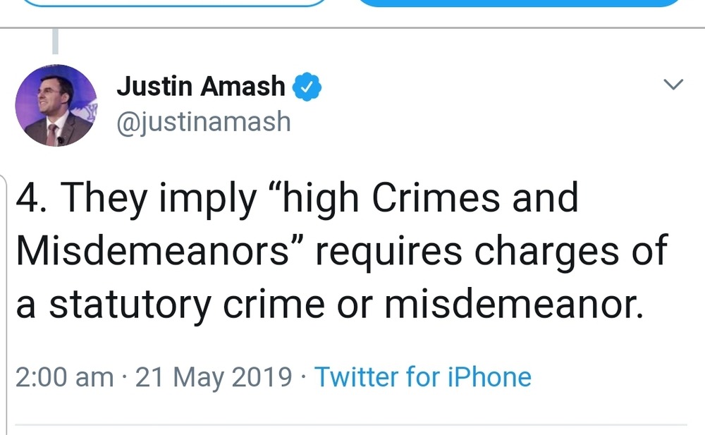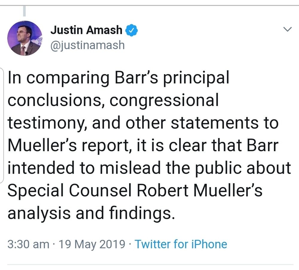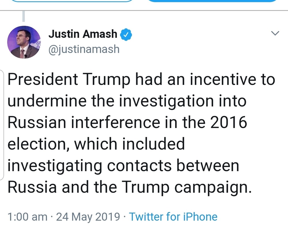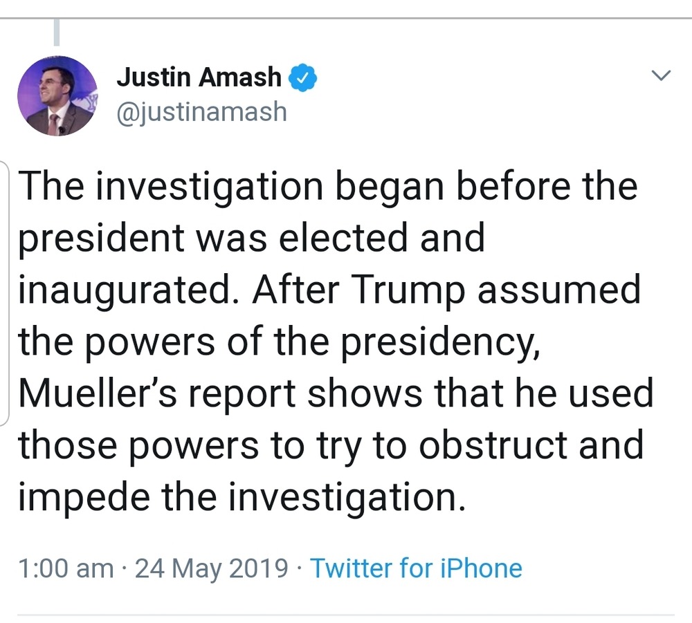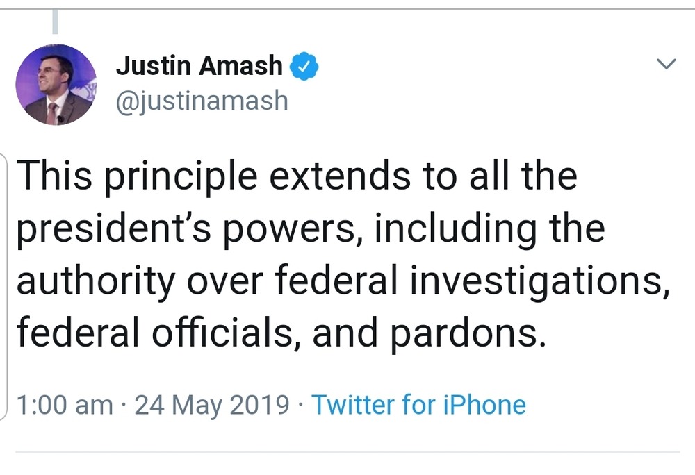 Recently he published a series of Tweets outlining the case for impeachment of President Trump. The case is clearly being made from a conservative and constitutional perspective. As yet, zero other Congressional Republicans have backed his call, though some of said they respect his brave stance and that clearly the Mueller Report raises concerns: it may at least lead some Republicans and Independents to read the damned thing.