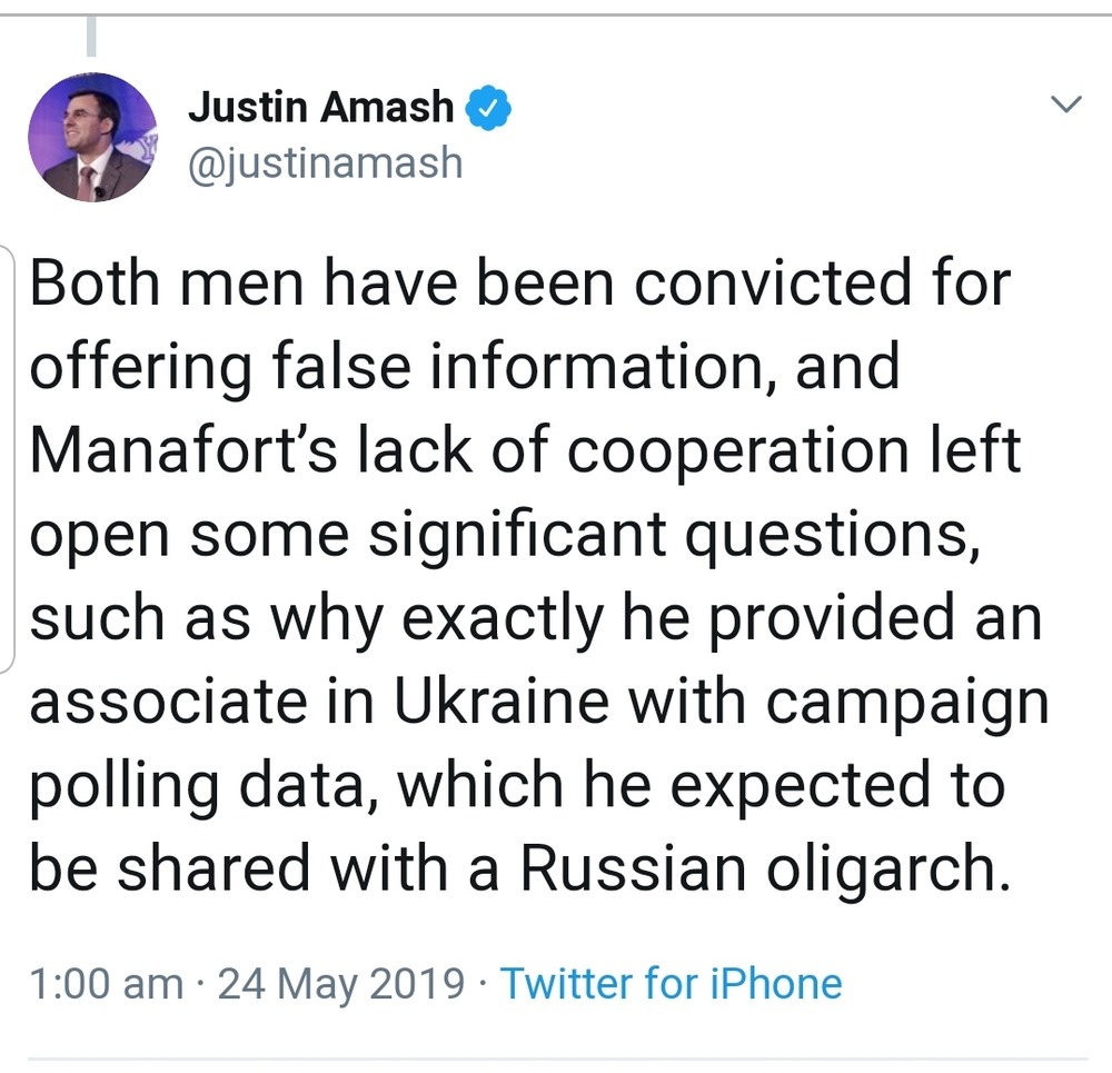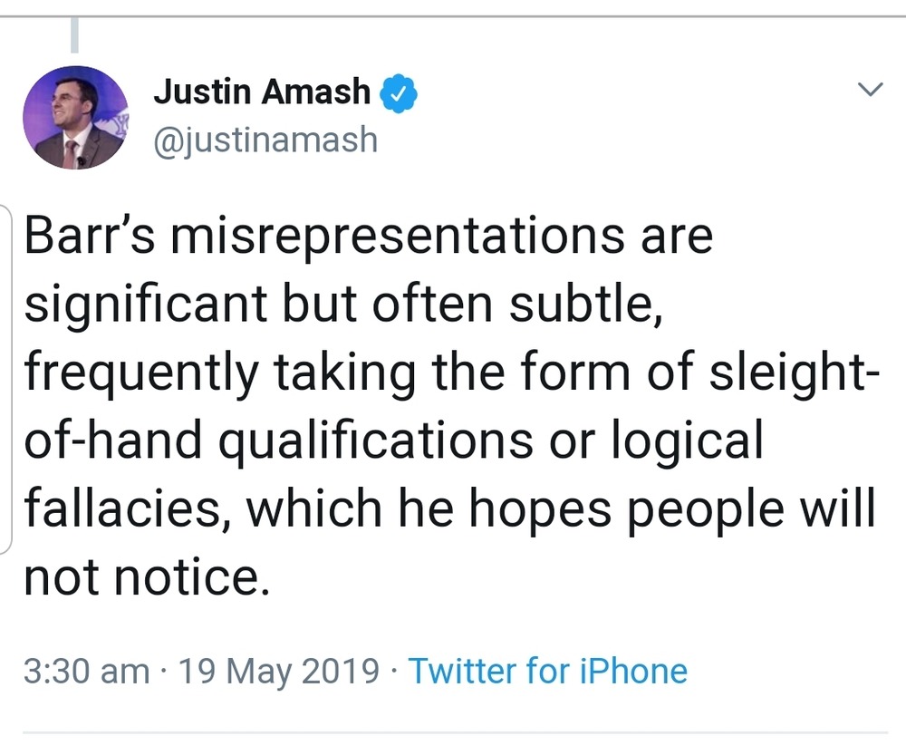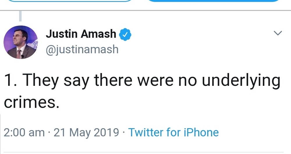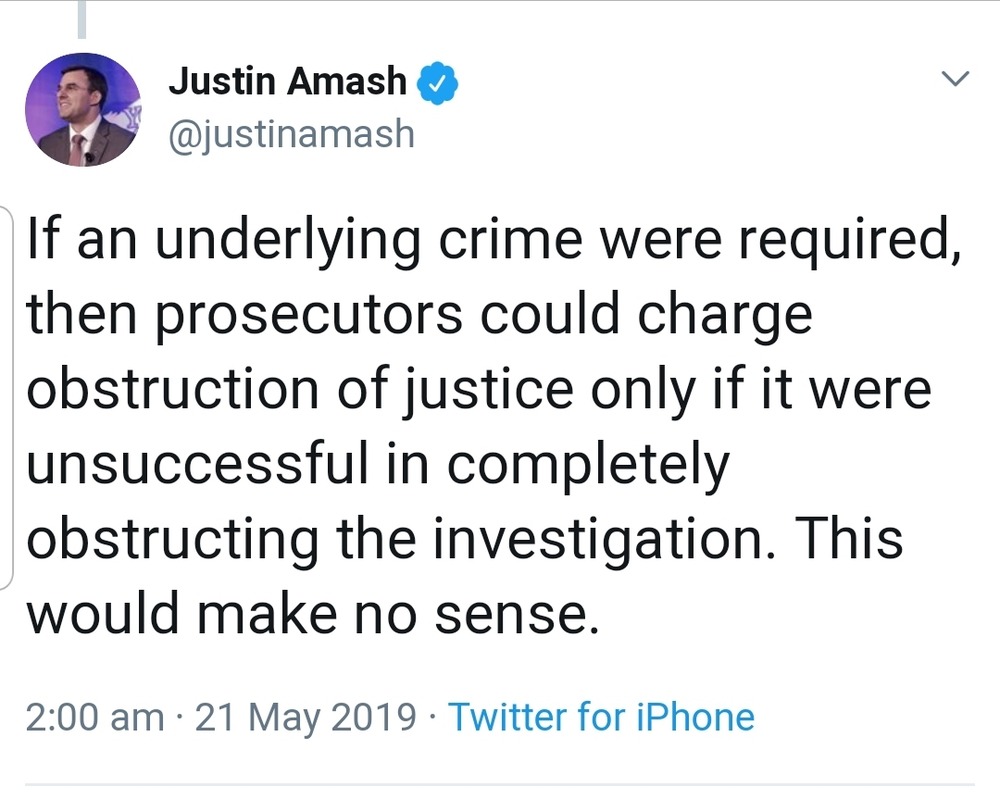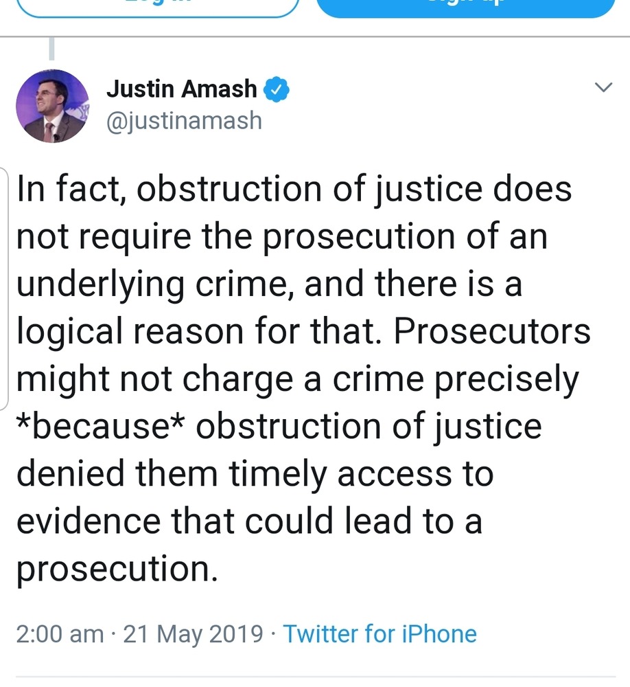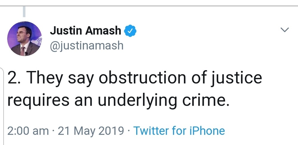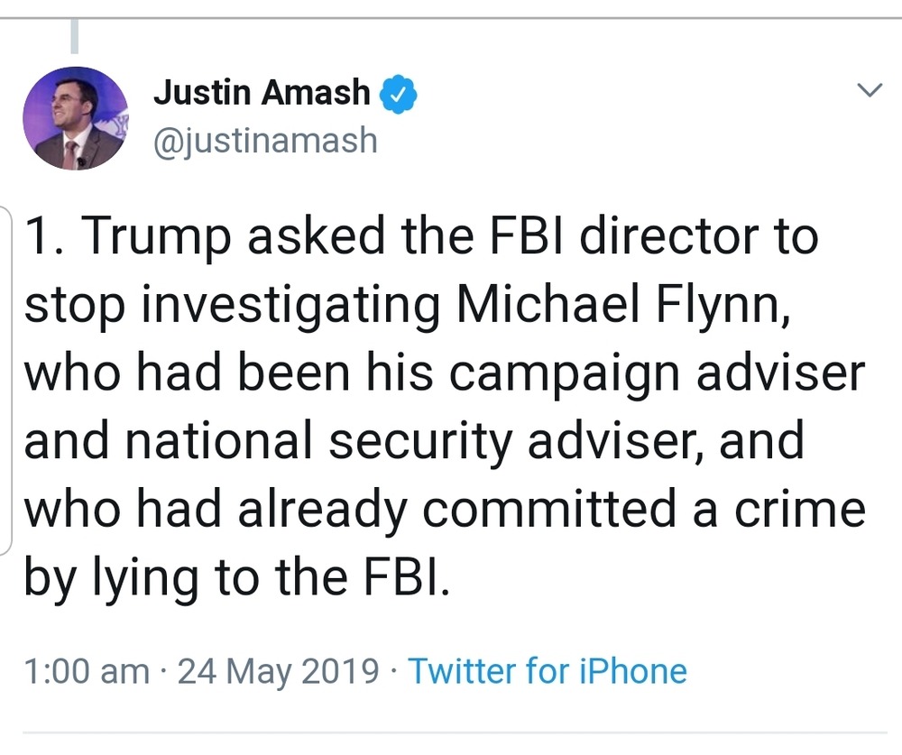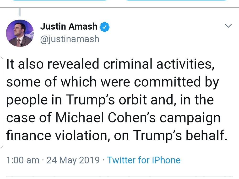 Recently he published a series of Tweets outlining the case for impeachment of President Trump. The case is clearly being made from a conservative and constitutional perspective. As yet, zero other Congressional Republicans have backed his call, though some of said they respect his brave stance and that clearly the Mueller Report raises concerns: it may at least lead some Republicans and Independents to read the damned thing.
