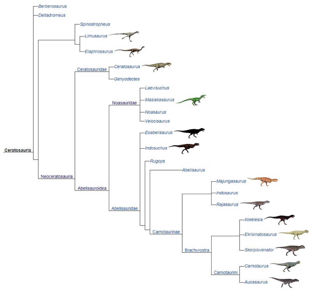 Ceratosauria is a sister group of the Tetanurae, which includes most theropods, “including megalosauroids, allosauroids, tyrannosauroids, ornithomimosaurs, maniraptorans, and birds. Tetanurae likely diverged from its sister group, Ceratosauria, during the late Triassic.”