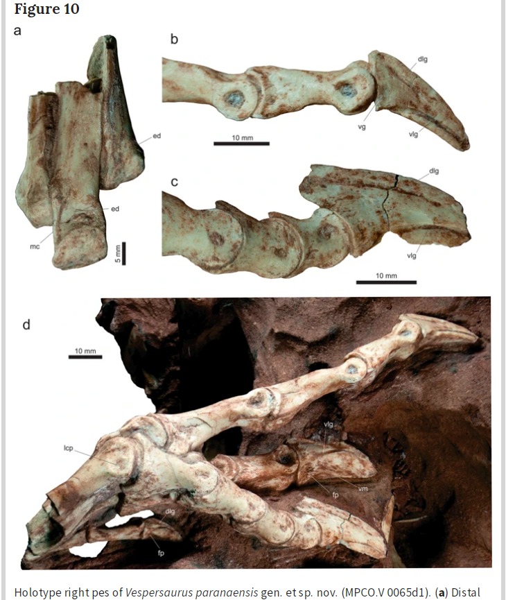 >>As you probably remember from Jurassic Park, velociraptors (and similar dinosaurs) were known for the terrifying sickle-shaped claws on their toes. And that was just with one on each foot – a newly-discovered dinosaur from a related species was packing twice as many weapons. Vespersaurus paranaensis has been found to brandish two large claws on each foot, supporting itself on just one toe.<<