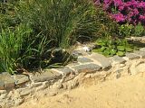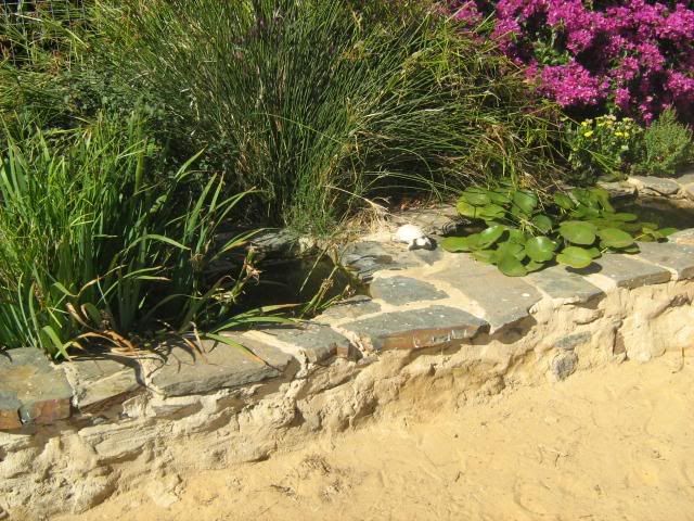 the ponds are old metal bath – giveaways – then just rough stone rubble walls. very good and cheap.