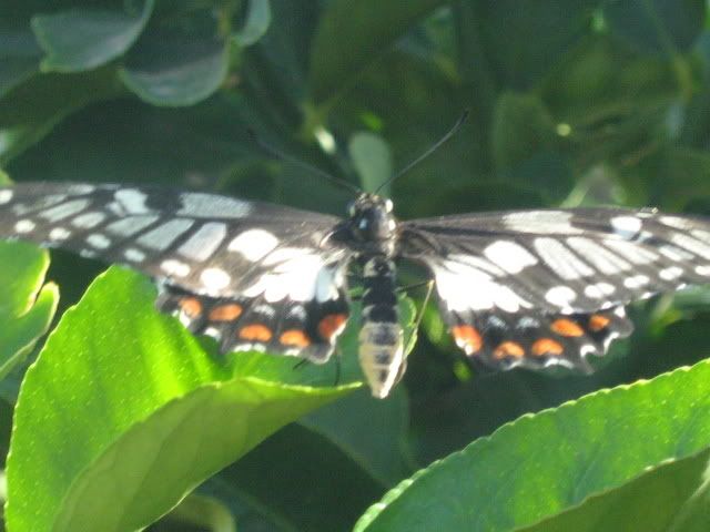 the butterfly is the swallowtale i believe and the pillar is the citrus pillar – its just that our pillar has little brown/orange baubles on its back with tiny black spikes coming off each bauble. your caterpillar looks like a cucumber with a red thingy poking out LOL.