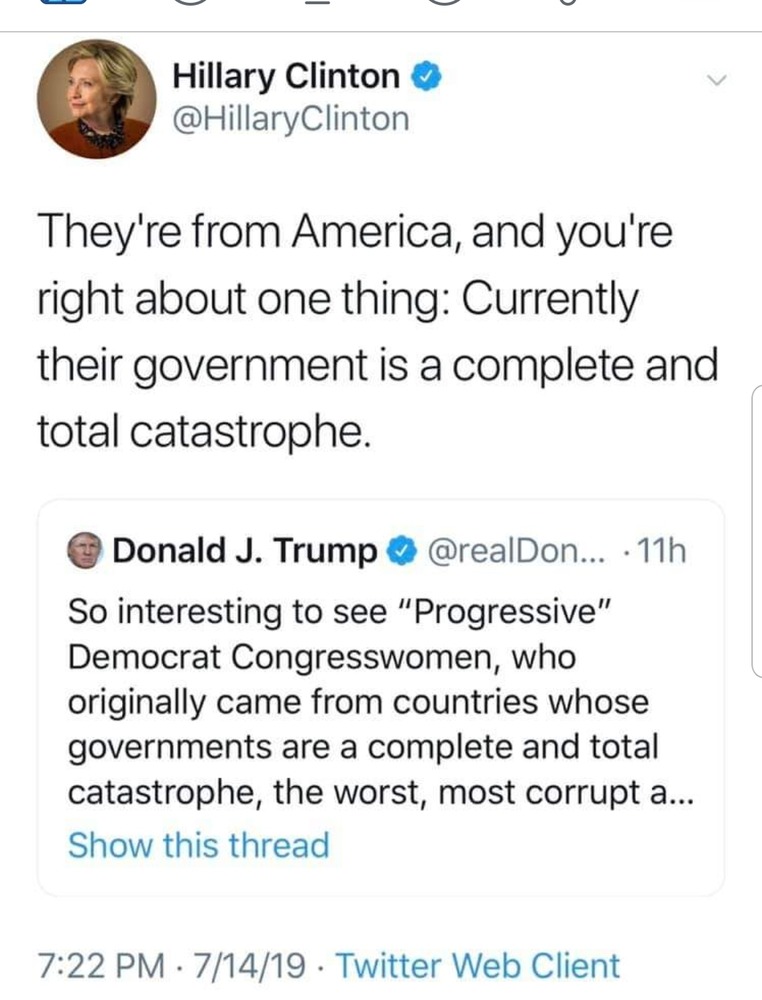 roughbarked said:The US President tells a number of prominent Democratic Congresswomen to go back to the “totally broken and crime-infested places from which they came”, despite them all being American citizens and all but one being born in the US.