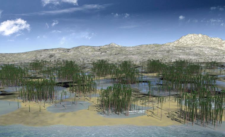These are amongst the first plants to colonise the land when it was little more than rocks and eroding clays. The illustration illustrates this type of environment with colonies of these vascular small trees that grew in wet clay soils, not unlike the mangroves of today. Interestingly relatives of these plants still exist in marshy ground of streams and swamps. but these are very small by comparison, often less than 10 cm in height compared to the 10 foot trees of these early forests. Reproduction was by spores more like ferns than trees of today that produce flowers or cones with seed.