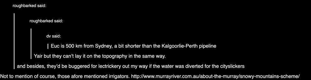 Croppers can feed ten times as many people as graziers. The issue comes out of what is notionally decribed as water for stock and domestic having a higher priority, rorted by those who have stock.