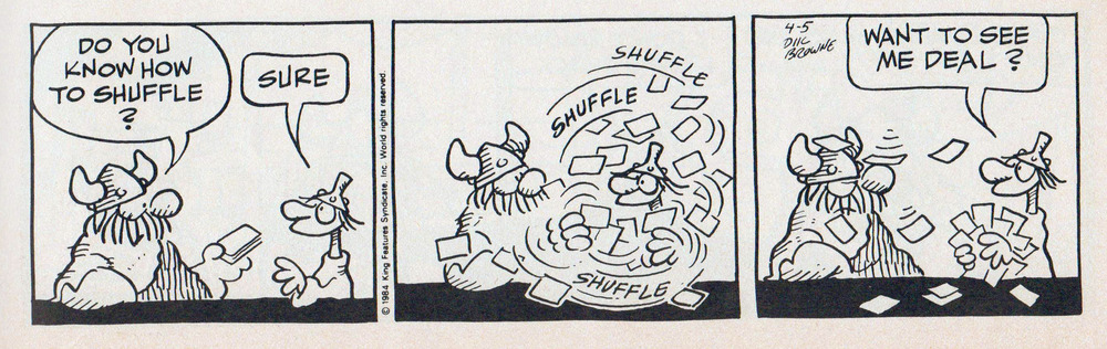 b) The plain shuffle is a set of cuts. But how many cuts? Perhaps aim for in the rough order of ceiling(sqrt(n)) cuts. 3 cuts for 6 cards, 4 cuts for 10 cards, 8 cuts for 52 cards? But what is the acceptable range for the number of cuts? So a typical plain shuffle might be 9784562301. One cheat would be to keep the bottom cards on the bottom such as 8745623019. Then there’s shuffling to the bottom of the deck such as 9876432105. A plain cut always moves a the middle of the deck towards the outside, usually front, and the front of the deck towards the back. Two iterations of 9876543210 take you straight back where you started, 0123456789. For every acceptable plain shuffle, there is a second acceptable(?) plain shuffle that is the exact inverse.