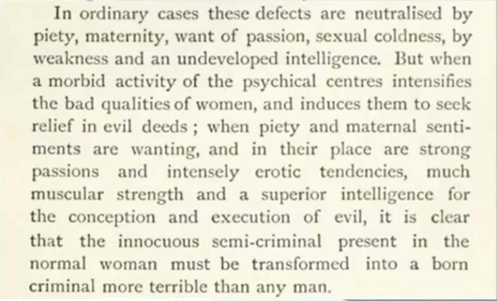 To Lombroso, women were either marryable, fuckable or criminal… which translates to Good looking, ok looking but wouldn’t marry them, or ugly)