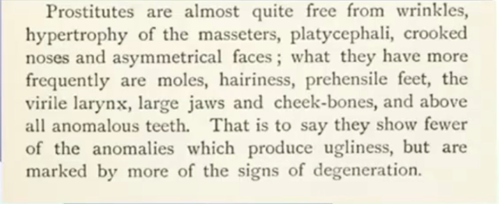 To Lombroso, women were either marryable, fuckable or criminal… which translates to Good looking, ok looking but wouldn’t marry them, or ugly)