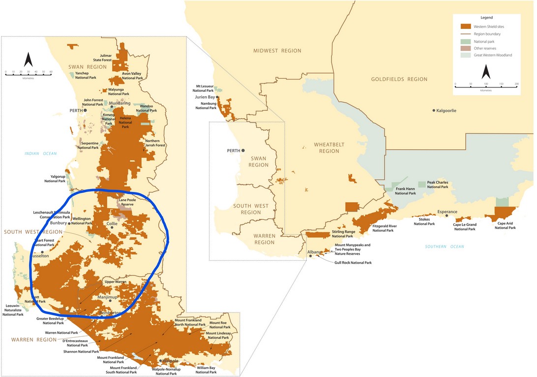 “Western Shield is a government funded conservation project that is dedicated to managing introduced predators, primarily foxes and cats, that threaten native wildlife in Western Australia. The program has been in operation in Western Australia since 1996 and in that period the program has been largely responsible for the recovery and return of a number of Western Australia’s small to medium size mammals and birds. Species that have benefited from the program include the woylie, quenda, numbat and chuditch. However, although Western Shield has been successful in controlling foxes, foxes continue to come into our unfenced but managed areas from surrounding lands. Cats also continue to be a problem but as yet we don’t know how big this problem may be.”