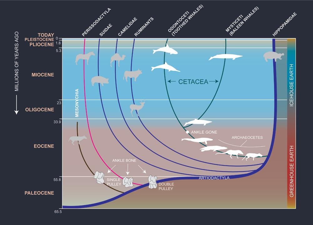 “Modern whales use their tails to swim and have evolved vertebral columns, as well as back and abdominal muscles, to power the tail,” Uhen says. Aegicetus didn’t have these anatomical features, and it lacks the skeletal specializations to support a broad tail fluke. Instead, the whale probably swam in a way that would look strange to us, undulating its midsection and long tail while steering with the forelimbs, a creature right at the crux of a stunning evolutionary transformation.<<