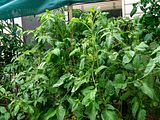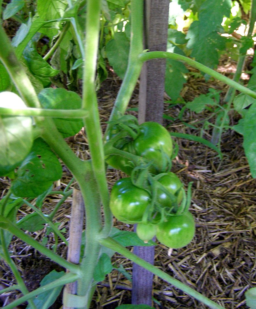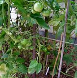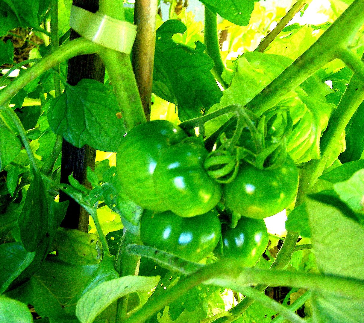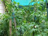 These tomatoes are out of control! They are so tall now they’ve gone past the tallest stakes I have and are travelling back down again. I took the growing tips out of them ages ago, but they just make new ones and keep going up. They’re too high for the shadecloth roof now. I keep lifting branches up and tying them to whatever I can find. HELP! LOL! I’ve had a few ripe ones of the smaller varieties and very nice too.