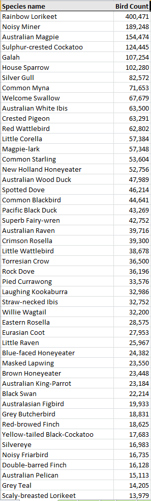 Finally. They’ve posted the results from the 2019 October surveyhttps://aussiebirdcount.org.au/2019-results/