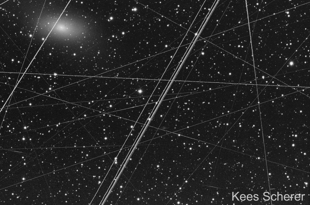 Low Earth Orbit optical tracking of space debris near the Andromeda galaxy that’s M110 in the image below. From https://apod.nasa.gov/apod/ap191014.html and https://apod.nasa.gov/apod/image/1910/M31Before_Scherer_4298.jpg