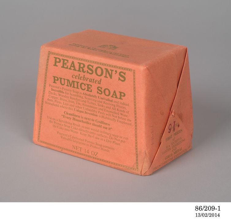 This is a bar of Pearson’s Pumice Sand Soap, made by the Pearson Soap Co. between 1908 and the 1930s. Pumice sand soap was advertised to scrub tables and floors as well as cleaning pots, pans and milk dishes. In 1908 the Pearson Soap Co. was located in Henry Street, Leichhardt, an inner Sydney suburb. Tallow was used to make both soap and candles. It is fat extracted from meat by treating it with steam.