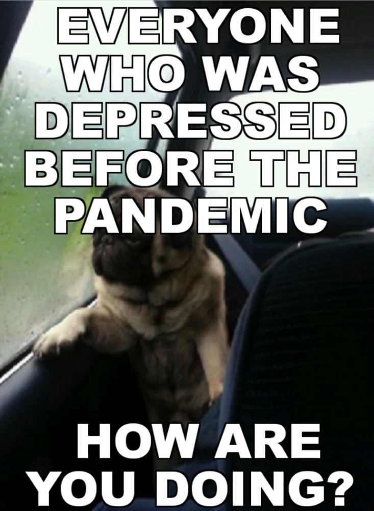 I was just thinking that hanging around depressed, not changing from your jammies, worried about what the fuck is happening to the world, pushing a bit of have to do stuff past the lap top, and having a bit of a cry….