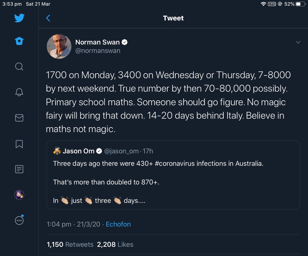 Doubling every 3 days for 28 days should get us close to 1000 times current numbers which would be… oh, we don’t know… 1000 sickies in Australia ¿