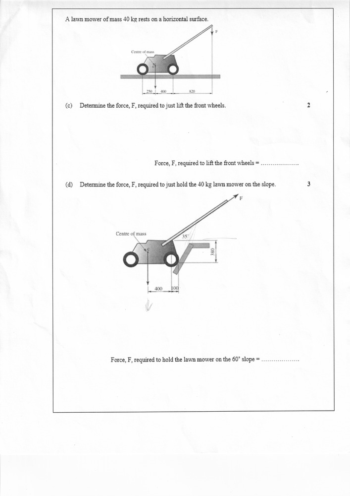 - an upward force to the right, at 35 degrees to the horizontal, from the left hand end of the reaction line to the top of the gravity line, representing the force on the handle.