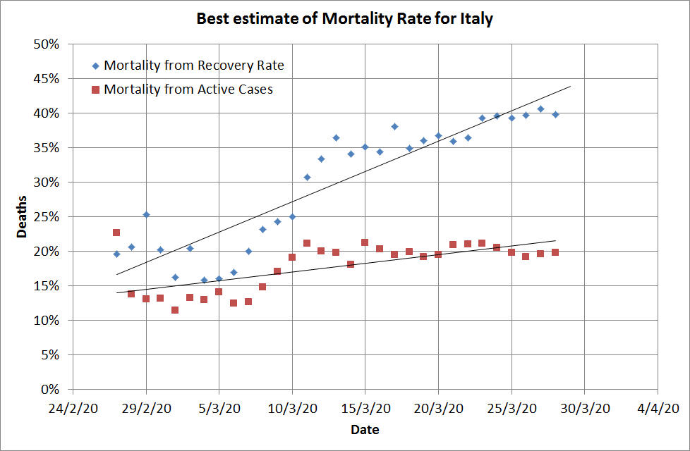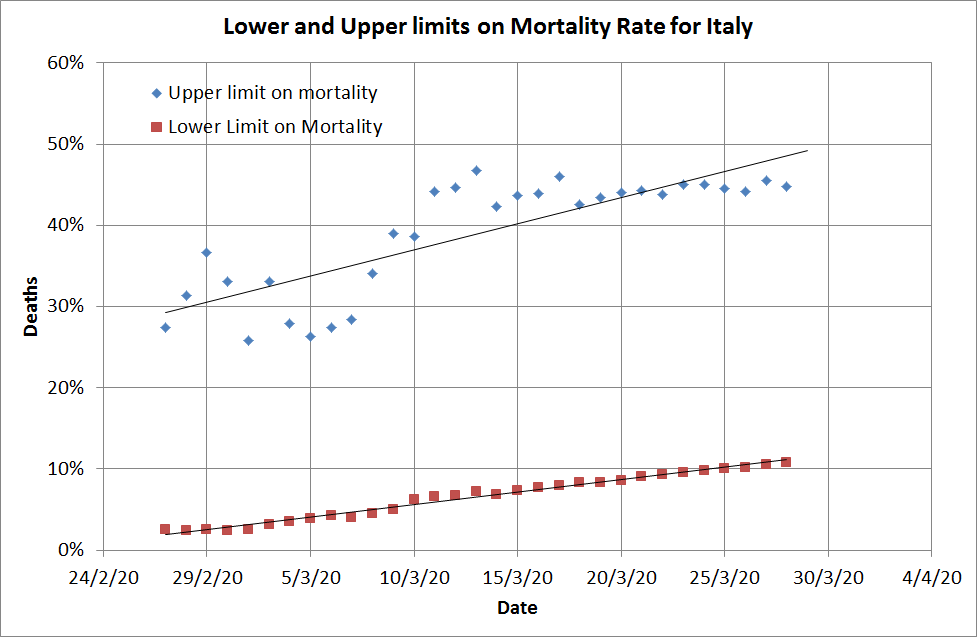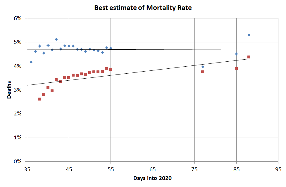 Things are going a little better than I was predicting earlier in the week. Based on extrapolating simple trends I had predicted that the USA would have 375,000 cases by now, but they’re well short of that. I was also thinking the UK would be over 50,000 but they’re under too.