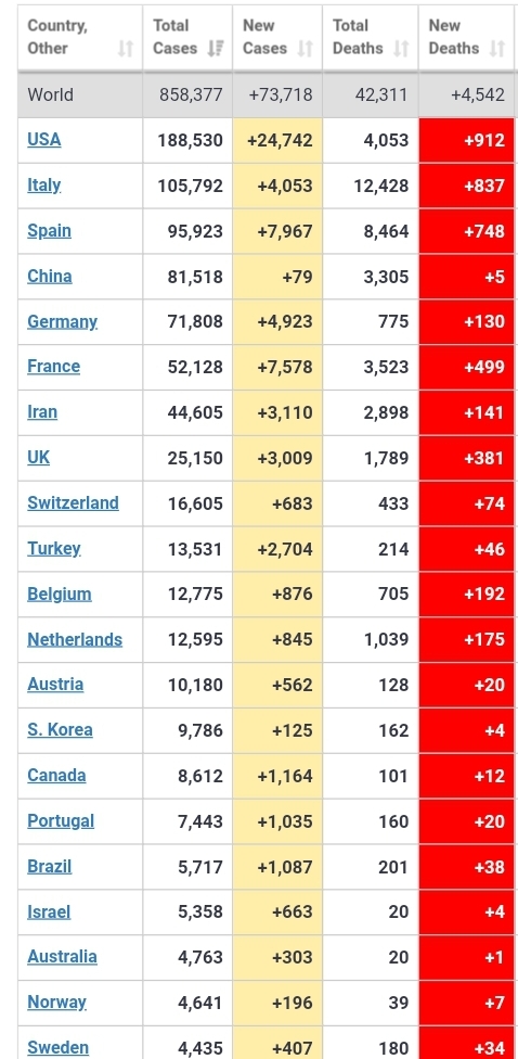 A few days ago someone was lamenting about the death toll reaching 20,000 ‘soon’.. todays JH map shows 30,780 deaths… a news article reported the death of an infant from the virus in the USA.. Trump reckons he doesn’t need to shut down NYC, and Australian cases are increasing mainly due to travellers.. (probably ship people)