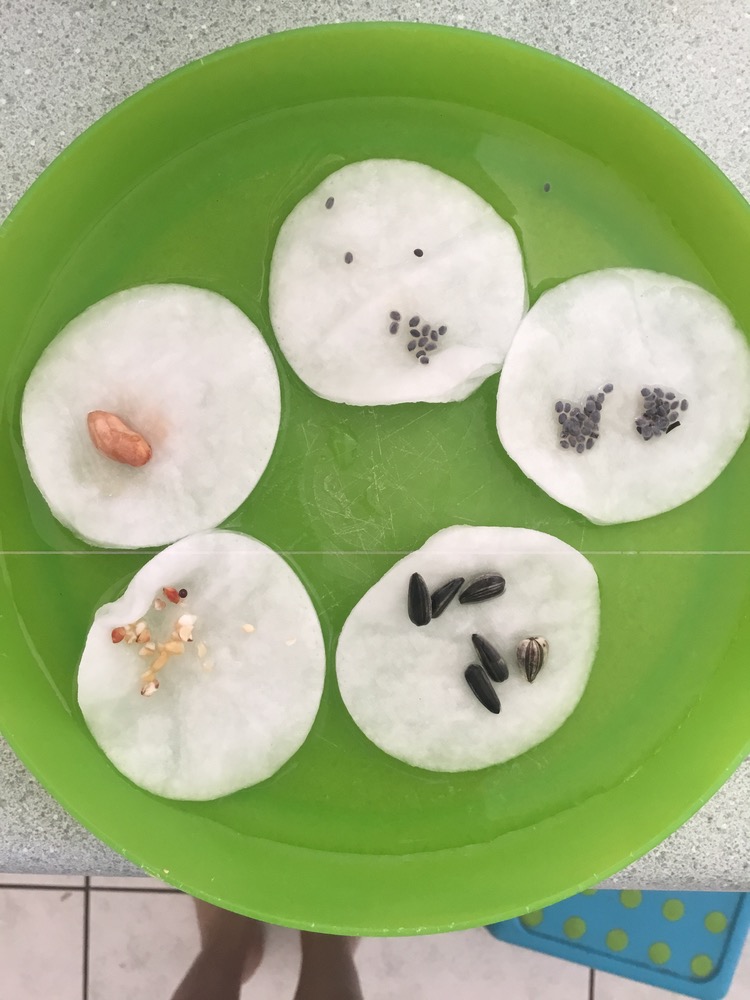 We ‘planted’ 2x basil seeds, 1 each of birdseed, sunflower seeds, and a peanut.