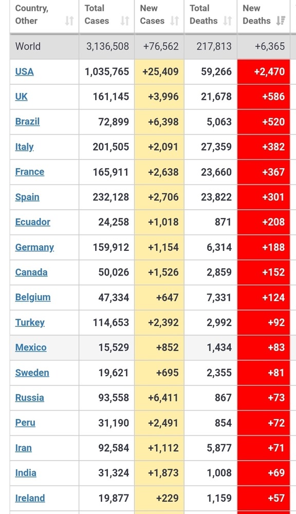 Crossed 200000 deaths overnight. The US will pass 1000000 cases Monday or Tuesday. 42% of active cases are in the US now.