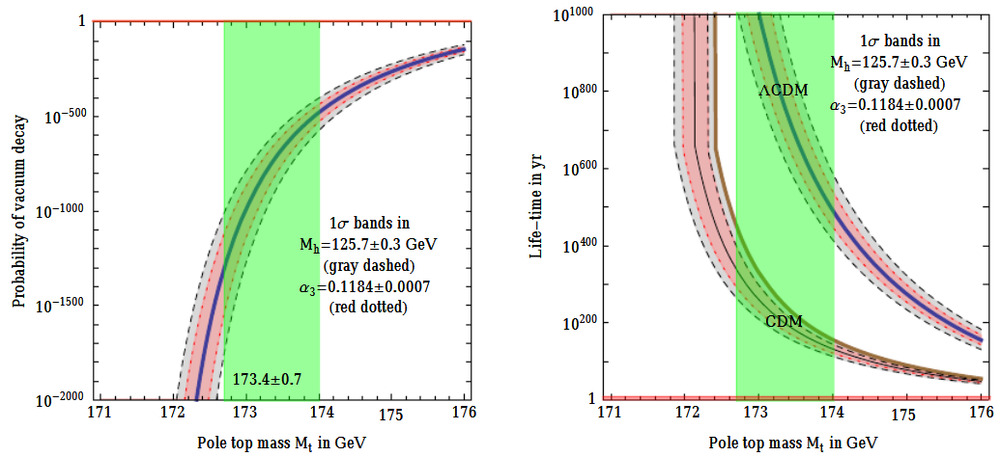 “The decay probability rate of the EW vacuum per unit time and unit volume can be calculated by semiclassical methods, it is basically …one gets for the decay rate the numerical estimate d p/(dV dt)∼h^4 exp(−2600/(|λ|/0.01)).”