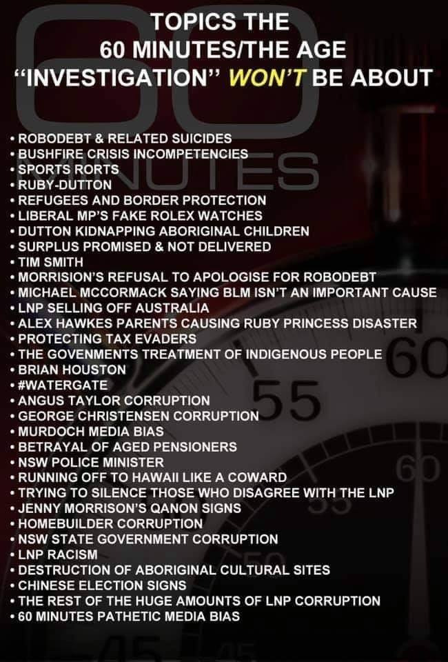 There are quite a few furphies on that list. They did do a thing on the Indue card. It was almost positive.I read a couple of people complain about how what they said wasn’t aired but a sound bite of what they said was used that made them sound supportive.